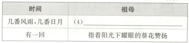 (3)空,结合“这以后的每一天”,找到第⑥段中“这以后的每一天,祖母总要去葵花地跑几个来回,为葵花苗锄草、松土、浇水和施肥”可概括出:为葵花苗锄草、松土、浇水和施肥。第