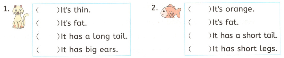 1.(√)It's thin. (√)It has a long tail. 2.(√)It's orange. (√)It's fat. (√)It has a short tail.