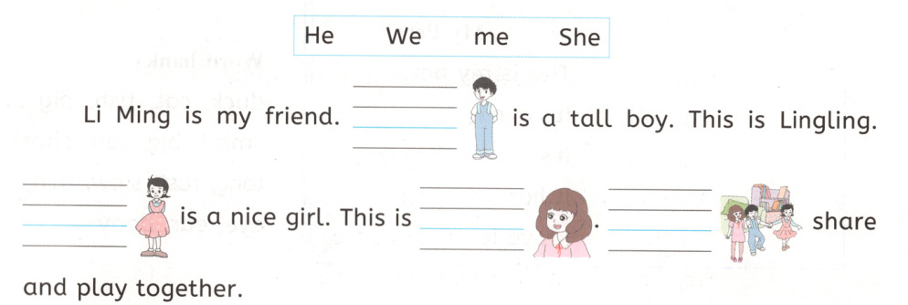 Hello, I have two good friends. This is Lily. 1. ________ likes to sing. This is Tom. 2. ________ likes to run. This is 3. ________. I like to dance. 4. ________ play together. What about you?