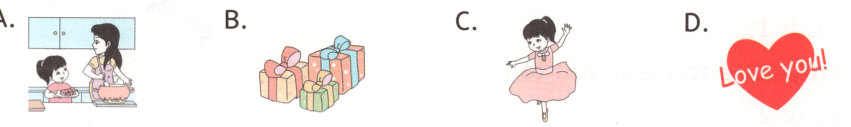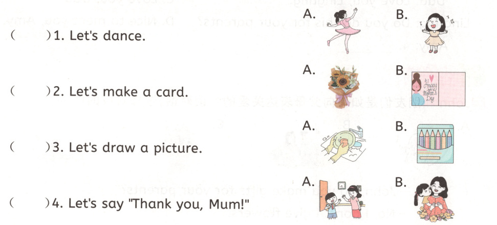 三 丽丽和朋友们计划为“母亲节”举行庆祝活动。根据描述,选出对应的图片。