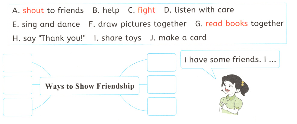 Step 3 和朋友们友好相处的方式有哪些?结合实际情况,选出合适的选项完成思维导图,并说一说。