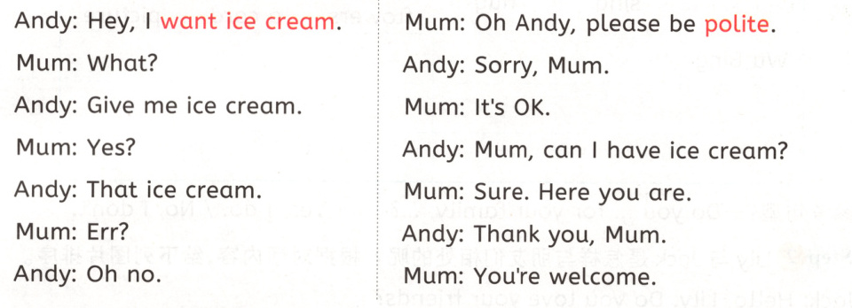 任务一:我们该如何礼貌地与人相处呢?请用“﹏﹏”画出对话中的礼貌性句子。