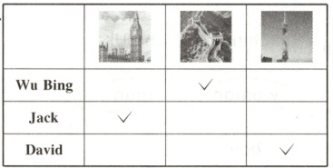 Lily还认识了三位新同学。听录音,在他们家乡城市的地标性建筑下面画“√”。