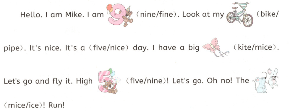 nine ; bike ; nice ; kite ; five ; mice