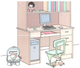Word bank: doll, ball, car, computer, pen, pencil box, bag, eraser, ruler, book, in, on, under ...