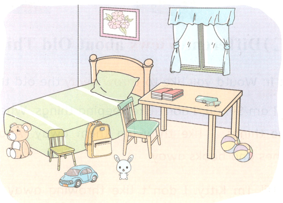 My name is Mike. I'm ten years old. I have many old toys and school things in my bedroom. I have an old toy rabbit, an old toy car and two old balls. They are on the floor. I also have some old books, an old pencil box and an old pen. They are on the table.