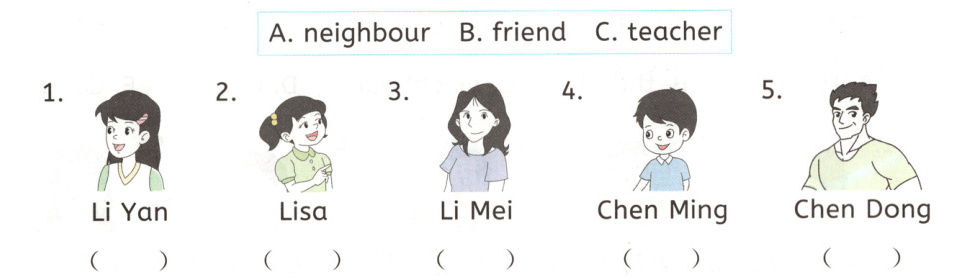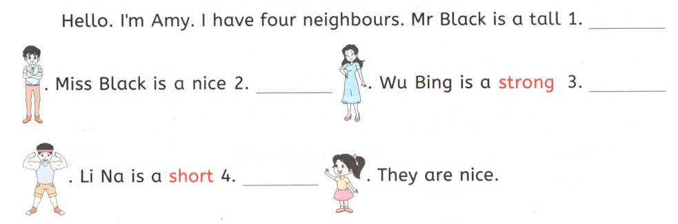 三让我们一起来认识一下Amy的新邻居吧。根据图片提示,选择合适的单词。