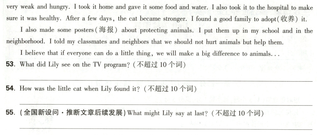 D篇: 53. She saw that many animals are in danger. 54. It was very weak and hungry. 【解析】细节理解题。题干意为:当 Lily 发现小猫时,小猫怎么样? 根据第二段中的“Once, I found a little cat by the roadside(路边). It was very weak and hungry.”可知,当 Lily 发现小猫时,小猫又虚弱又饥饿。 55. Let’s work together to protect our animal friends./Let’s protect animals together. 【解析】推断文章后续发展题。题干意为:Lily 最后可能会说什么? 根据最后一段中的“I believe that if everyone can do a little thing, we will make a big difference to animals...”可知,她可能会号召人们保护动物。