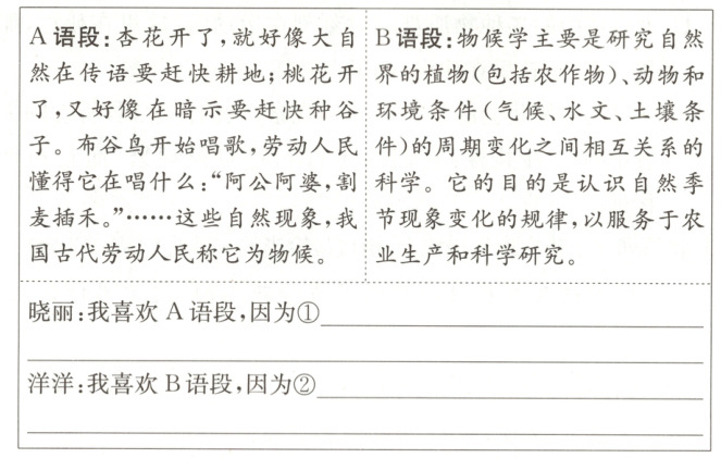 8. 示例:①A语段语言生动,运用了拟人的修辞手法,生动形象地写出了大自然中丰富的物候现象,体现了说明文语言的生动性特点。 ②B语段开门见山地介绍了物候学的概念,语言准确、平实,措辞严谨,体现出说明文语言的科学性特点。