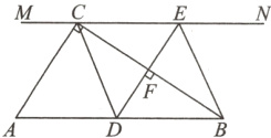 15. (12分)如图,在Rt△ABC中,∠ACB = 90°,过点C的直线MN//AB,D为AB边上一点,过点D作DE⊥BC,交直线MN于点E,垂足为F,连接CD,BE.