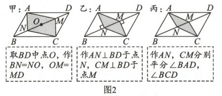 8.(河北省中考)如图1,□ABCD中,AD>AB,∠ABC为锐角.要在对角线BD上找点N,M,使四边形ANCM为平行四边形,现有图2中的甲、乙、丙三种方案,则正确的方案( )