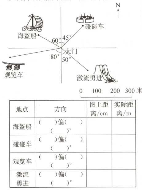 2. 下面是凤凰岛游乐场的部分平面图。以大门为观测点,先量一量,再填表。