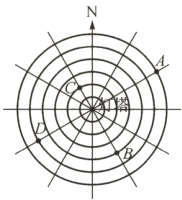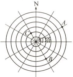 1. 下图是一个雷达屏幕上显示的某海域的轮船位置,每两个相邻圆之间的距离是5千米。以灯塔为观测点。