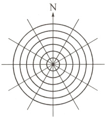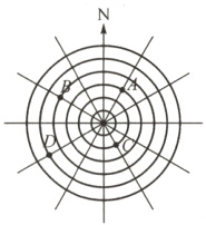 1. 下图是一个飞机场的雷达屏幕,每两个相邻圆之间的距离是10千米。以机场(正中央黑点)为观测点,飞机A、B、C、D的位置分别如下。