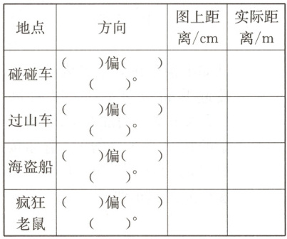 碰碰车:北偏东45° 1.5 150 过山车:南偏东80° 3.5 350 海盗船:南偏西50° 2.5 250 疯狂老鼠:北偏西30° 2 200