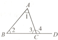 (4) 如右图所示,将三角形ABC的边BC延长到点D。已知∠1 = 60°,∠4 = 110°,则∠2 = ( )。