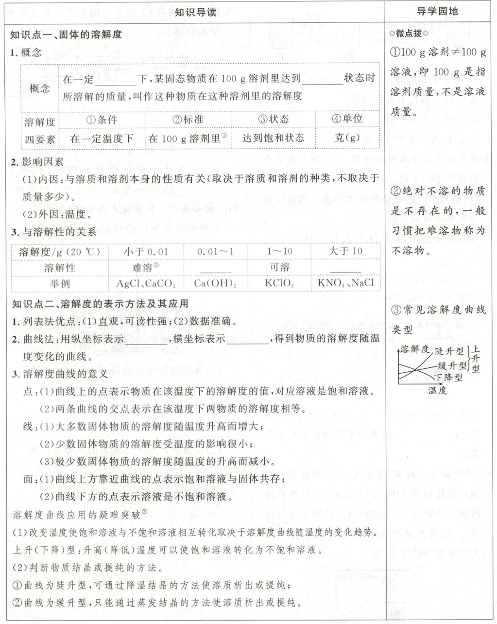 一、1.温度 饱和 3.微溶 易溶 二、2.溶解度 温度 三、饱和 小 大