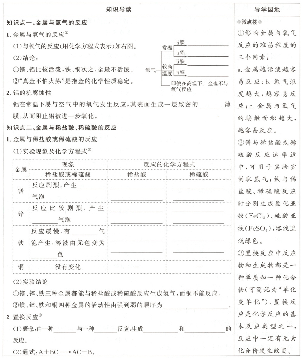 (1)大量 $Mg + 2HCl\xlongequal{\;\;}MgCl_{2} + H_{2}\uparrow$ $Mg + H_{2}SO_{4}\xlongequal{\;\;}MgSO_{4} + H_{2}\uparrow$ 较多 $Zn + 2HCl\xlongequal{\;\;}ZnCl_{2} + H_{2}\uparrow$ $Zn + H_{2}SO_{4}\xlongequal{\;\;}ZnSO_{4} + H_{2}\uparrow$ 少量 浅绿 $Fe + 2HCl\xlongequal{\;\;}FeCl_{2} + H_{2}\uparrow$ $Fe + H_{2}SO_{4}\xlongequal{\;\;}FeSO_{4} + H_{2}\uparrow$