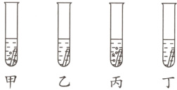 2. (湖北黄石中考)向装有等量的同种盐酸的四支试管中,分别随机加入相同规格的Mg、Fe、Cu、Ag片,甲和丙均有气泡产生,且丙更剧烈,乙和丁无明显现象(如图)。则甲中放置的是( )