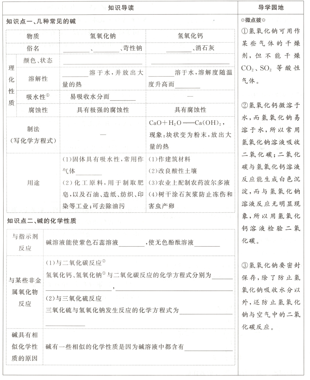 @@变蓝色 变红色 $Ca(OH)_2 + CO_2 = CaCO_3\downarrow + H_2O$ $2NaOH + CO_2 = Na_2CO_3 + H_2O$ $2NaOH + SO_3 = Na_2SO_4 + H_2O$ 氢氧根离子(或$OH^-$)