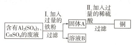 10.(核心素养·科学态度与责任)某化学兴趣小组的同学发现一工厂废液中含有${Al2(SO4)3}$、${CuSO4}$,为从废液中回收金属铜,设计流程如下:
