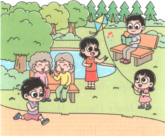 1. There is a woman. She is singing a song.2. There is a boy. He is running.3. There is a girl. She is flying a kite.4. There are two old women. They are talking.