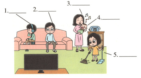 Hello! I'm David. I have a happy family. This is a picture of my family. Look at the girl. She is my sister, Mary. She is cleaning the floor. The man on the sofa (沙发) is my father. He is watching TV. My little brother Thomas is crying. My mother is singing a song to him. Do you see me? I'm listening to music on the sofa. I like music very much.