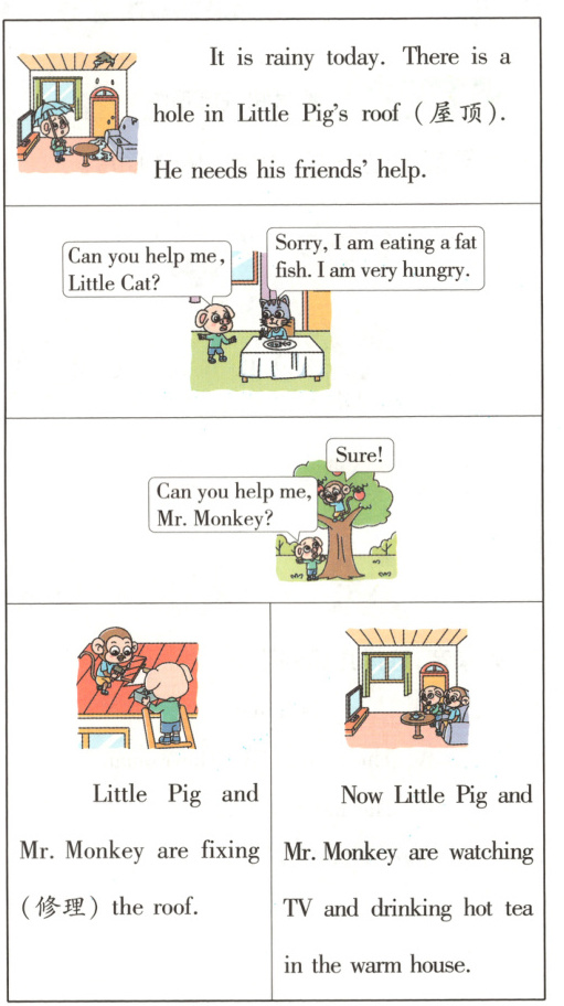 4. What are Little Pig and Mr. Monkey doing in the warm house?