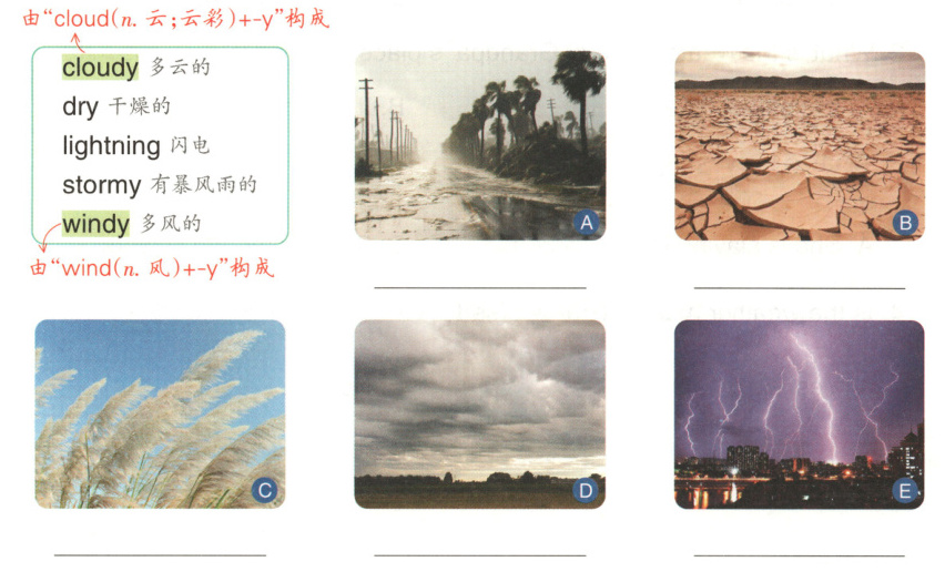 参考答案 A—stormy B—dry C—windy D—cloudy E—lightning