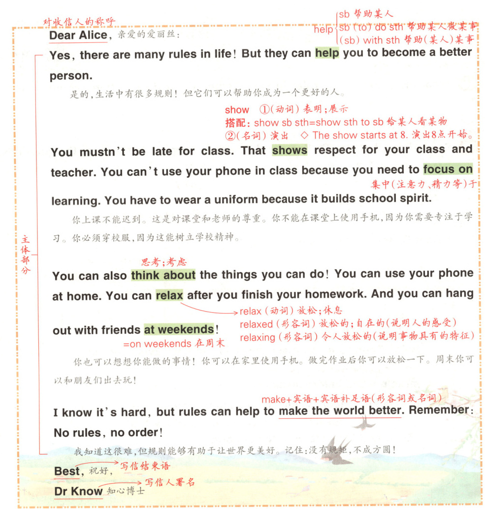 阅读爱丽丝写给知心博士的信和知心博士的回信。然后回答问题。