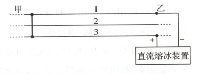 15. 如图为位于某电网线路上相距几十千米的甲、乙两地之间输电线和处于乙地的熔冰装置示意图,它接上电流后几十千米电线上的冰雪会熔化,从而避免电网被冰雪压断。熔冰装置上的“+”“-”是两个接线端,若要对甲、乙两地之间的“1”和“3”两根输电线同时熔冰,请你在图中以笔画线代替导线,进行切实可行的连接,实现熔冰(进行熔冰时电源已切断)。
