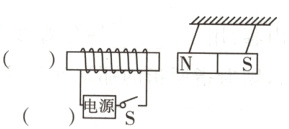 8. (鞍山中考)如图所示,在螺线管旁悬挂一条形磁体。闭合开关后,条形磁体向左偏。请在括号内标出: