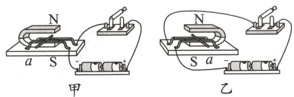 (2)仅把磁体左右换位,如图乙所示。开关闭合后,通电导体a是否会向右运动?原因是什么?