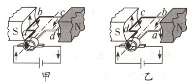 D 解析:由图可知,导线ab在这两个时刻电流方向不同,由于导体受力方向与磁场方向和电流方向有关,所以两个时刻导线ab的受力方向不同,故A正确;平衡位置是指线圈平面与磁感线垂直的位置,图中磁感线从右向左,故甲、乙两图中的线圈再转动90度角,都能到达平衡位置,故B正确;由图可知,电源的左侧为正极,从上往下看,线圈中的电流都是顺时针方向,故C正确;电动机之所以能转动,是因为换向器在线圈转过平衡位置时改变了线圈中电流的方向,即电动机线圈外通过的是方向不变的电流,线圈内因为换向器的作用,电流方向在改变,故D错误。