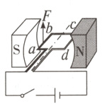3. 如图所示,线圈abcd位于磁场中,当开关接通时,ab段导线受磁场力F的方向向上,此时cd段导线受磁场力( )