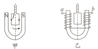 5. 一矩形线圈放在蹄形磁铁的两极之间,刚通电时在磁场作用下扭转方向如图甲所示。现将该线圈放在图乙所示的蹄形螺线管间,a、b为螺线管与电源的接口。某同学进行了如下四次操作: