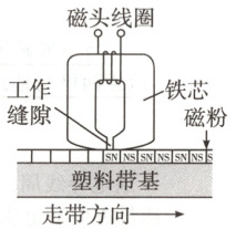5.(九全 P141 图 20.5 - 7 变式)铁棒和钢棒本来不能吸引钢铁,但当磁体靠近它们或与它们接触时,它们便有了吸引钢铁的性质,也就是被磁化了。软铁磁化后,磁性很容易消失,称为软磁性材料。而钢等物质在磁化后,磁性能够保持,称为硬磁性材料。硬磁性材料可以做成永磁体,还可用来记录声音。录音机的磁带上就附有一层硬磁性材料制成的小颗粒。录音时,声音先转变成强弱变化的电流,这样的电流通过录音磁头,产生了强弱变化的磁场。磁带划过时,磁带上的小颗粒被强弱不同的磁化,于是记录了一连串有关磁性变化的信息(如图)。