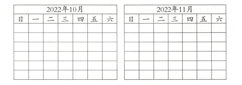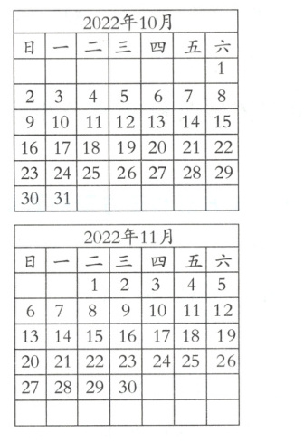 5. 2022年10月的最后一天是星期一。请你根据这个信息制作2022年10月和11月的月历表,并回答问题。(12分)
