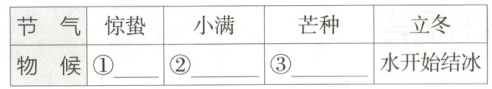 (3) 小涵在参与“节气和物候”活动小组讨论时,大屏幕上有一道节气与物候的搭配题,请你将正确选项的序号填入表格。