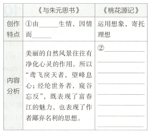 (4)①景 明志 ②作者虚构了一个宁静祥和的世外桃源,描绘了一幅没有剥削、压迫,人人安居乐业,彼此和睦相处的生活图景,表达了对黑暗现实的不满和对和平生活的向往。