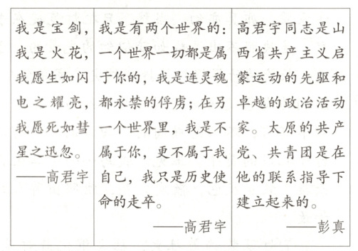 (1)同学们分享了高君宇的事迹、自题诗、书信及评价。请参考示例,以“他是火花 / 闪电 / 彗星”为开头,写下你的感言。