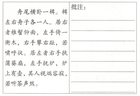 (3)[悟其理·赏析写法]《小石潭记》中的“潭中鱼可百许头,皆若空游无所依”写出了潭水的清澈。《核舟记》中的描写也很精彩。请将对下面选段的赏析批注在横线上。