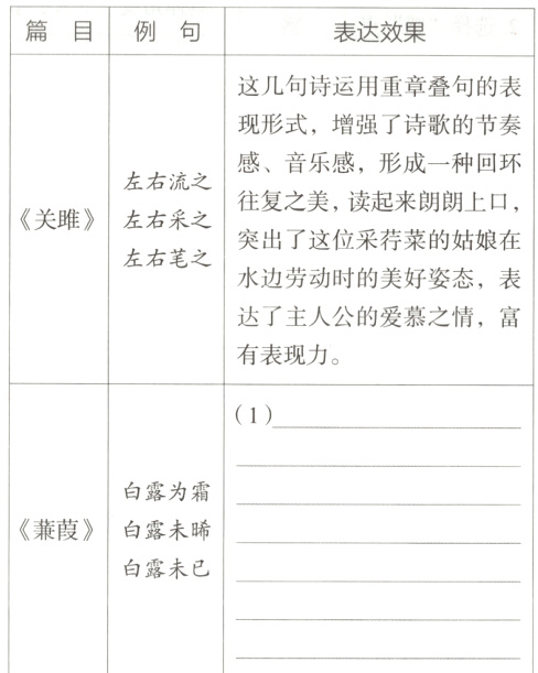《诗经》多采用重章叠句的表现形式,请结合具体语句分析诗中重章叠句的表达效果。