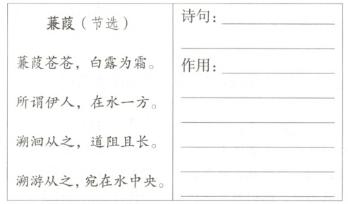 8. 《诗经》是中华民族珍贵的文化遗产之一,是中华文化宝库中的一颗明珠。班级开展以“学《诗经》,悟风韵”为主题的训练营。结合《关雎》《蒹葭》两首诗,完成以下任务。
