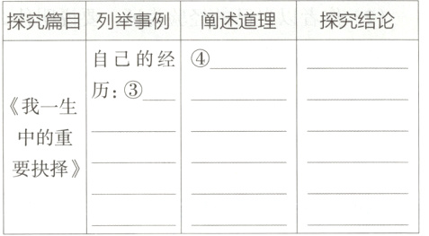 12. 同学们在读完《应有格物致知精神》和《我一生中的重要抉择》后,想要探究列举事例对于增强语言表现力的作用。他们整理出如下表格,请结合课文内容补全表格。