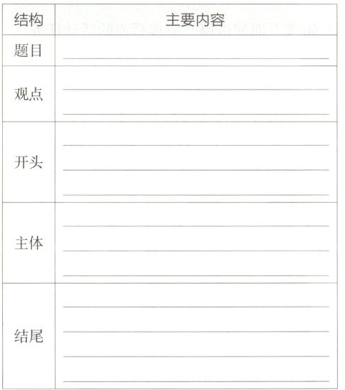 2. 每人从备选演讲稿题目中选一个(不能重复),根据表格提示拟写演讲提纲,接着在小组内交流,互相点评、修改。