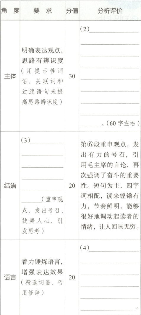 7. 同学们根据所学,设计了评价量表,并结合写作要求对以上文稿进行了分析评价。请你将空缺处补充完整。
