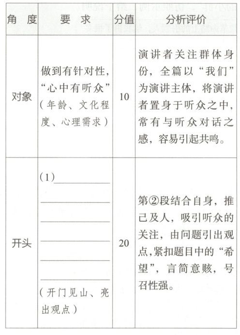 (2)【示例】主体思路清晰,第③段用设问引出对“希望”的诠释,再利用排比加以论证,增强了演讲词的气势。第④段则巧妙过渡,用“固然……但若只有……便只能……”巧妙说明“奋斗”的重要性,并引出下文对“奋斗”的论述