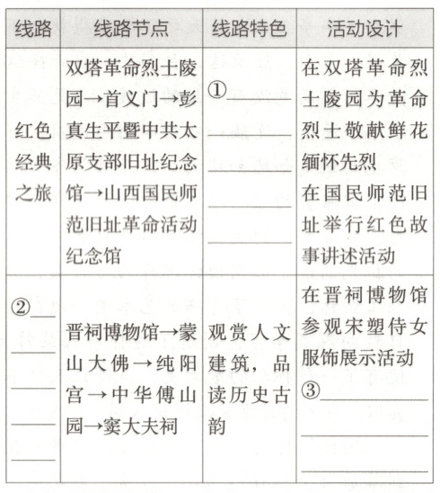 (1)【线路设计】小组同学设计了下面的研学路线,请你补全表格内容。