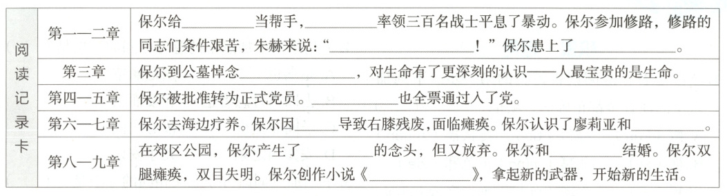 3. [2023吕梁期末·重点情节:文学创作]小丽准备以“悬崖边上的生命之舞”为题,分享自己的读书体会。下面是她整理的相关事件,请你结合名著内容,帮助她完善。